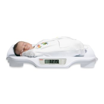 Hochwertige Babywaage mit abnehmbarer Wiegeschale und Batteriebetrieb.