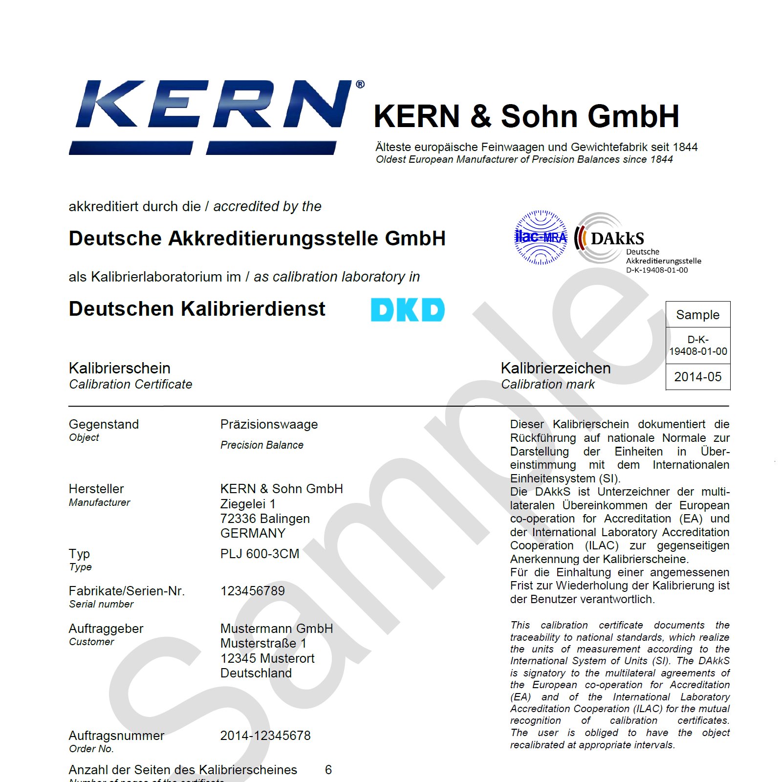 DAkkS-Kalibrierschein für Zählsysteme der Marke Kern mit Höchstlast Massewaage 5 kg bis 50 kg und Zählwaage bis 5 kg.