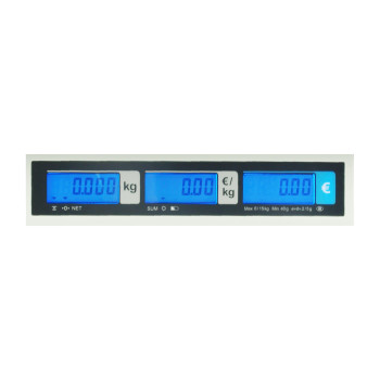 Sie zeigt dem Kunden und dem Bediener Gewicht, Preis und Betrag auf je drei großen hinterleuchteten LCD Anzeigen an. Für eine längere Akkulaufzeit können Sie die Beleuchtung ausschalten.